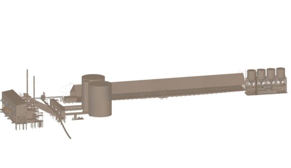 Our services included the design, calculation, and drafting of the steel support arrangements for this system, as well as the detail engineering for fabrication, adjusting sizes for container transport, and assembly of the structures. We also verified the suitability of the existing structures (grinding buildings, warehouse, etc.) to support the new loads.