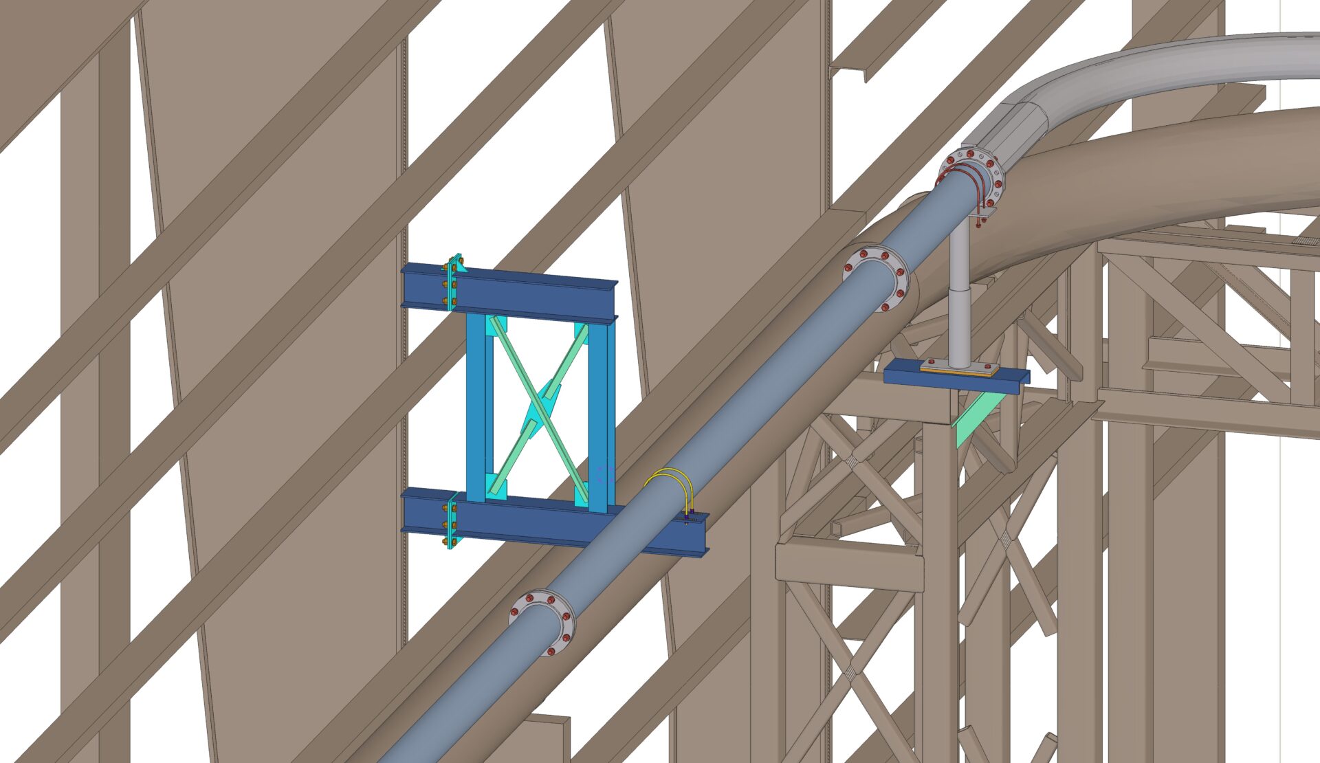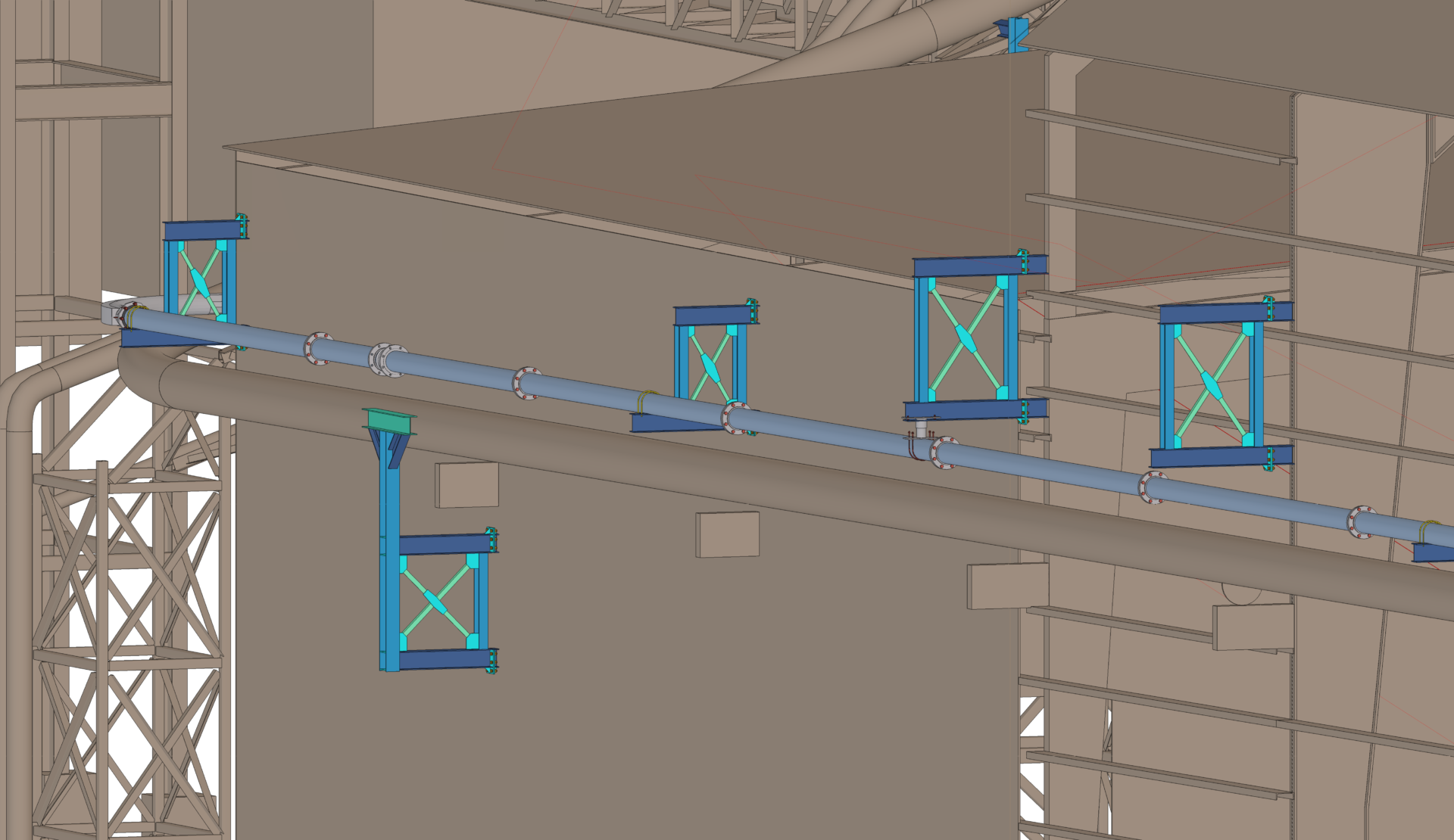 Nuestro cliente está planeando la construcción de un nuevo sistema de transporte neumático para AMRIZE en Ste. Geneviève (Estados Unidos). El nuevo sistema de transporte neumático es un conjunto de tuberías que se apoya en algunos edificios y estructuras existentes mediante diversos soportes.